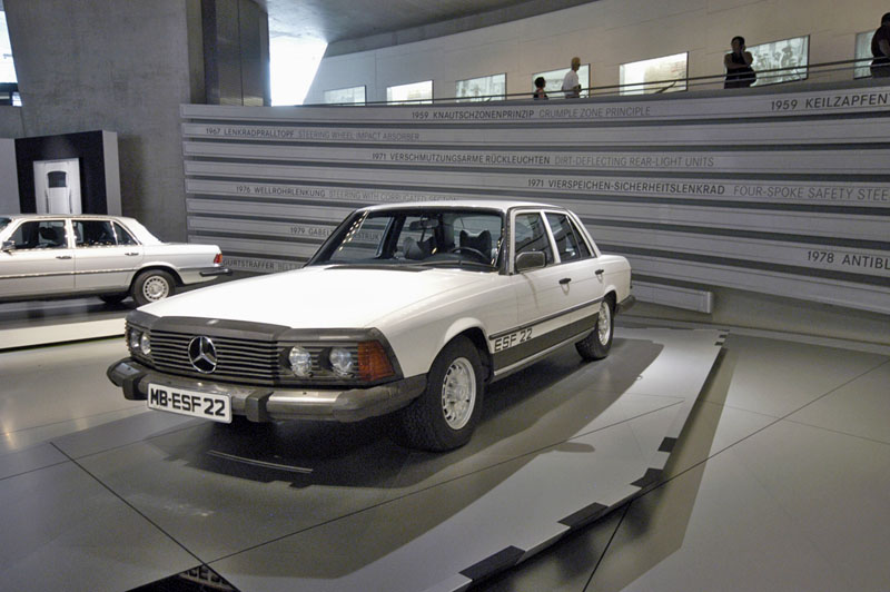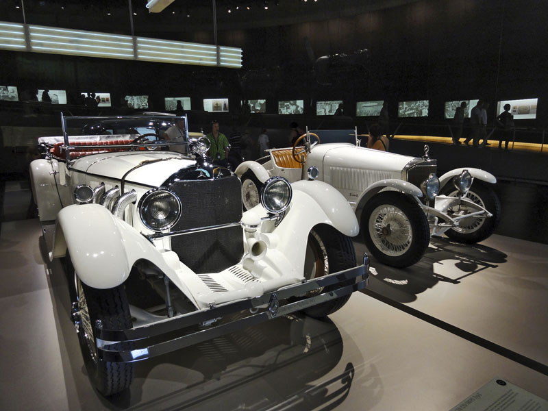Překvapením pak byly triumfy v automobilových soutěžích, k nimž patří vítězství sedanu typu 280 E v maratonu Londýn–Sydney 1977. Řada úspěšných závodních vozů je v muzeu vystavena na klopené dráze, podobně jako v Turínském automobilovém muzeu. Motoristický sport přispěl významnou měrou k vývoji sériových typů, Mercedes-Benz však patří i k největším průkopníkům aktivní a pasivní bezpečnosti; vystavená Heisswasserrakete sloužila k urychlování vozů pro nárazové testy a dvojice kabely propojených vozů, zkušebního sedanu 220 S (1964) a kombi 300 Messwagen (1960) pro sběr dat, připomíná doby, kdy ještě bezdrátová komunikace byla v plenkách. Vznětový motor se pod kapotou osobního automobilu Mercedes-Benz 260 D objevil už v roce 1936 (společné prvenství s Hanomagem), rotační motor typu Wankel (až čtyři rotory) se zkoušel v experimentálním kupé C‑111 od roku 1969, následovaly spalovací turbíny, vodíkové a plynové motory, jiná alternativní paliva, klasické elektromobily, hybridní vozy a vodíkové palivové články. Nešlo jen o osobní automobily, ale také o nákladní, autobusy, traktory a stroje Unimog. Rozmanitost historie Mercedes-Benz rozhodně za návštěvu stojí. Vřele doporučujeme, prohlídka muzea začíná od nejvyššího patra směrem dolů (vyjedete futuristickým výtahem), prochází pěti sekcemi Galerie a sedmi Mythos; v přízemí jsou pak kavárna, restaurace, obchody, průchod do reprezentační prodejny Mercedes-Benz Center a přilehlé parkovací garáže.
