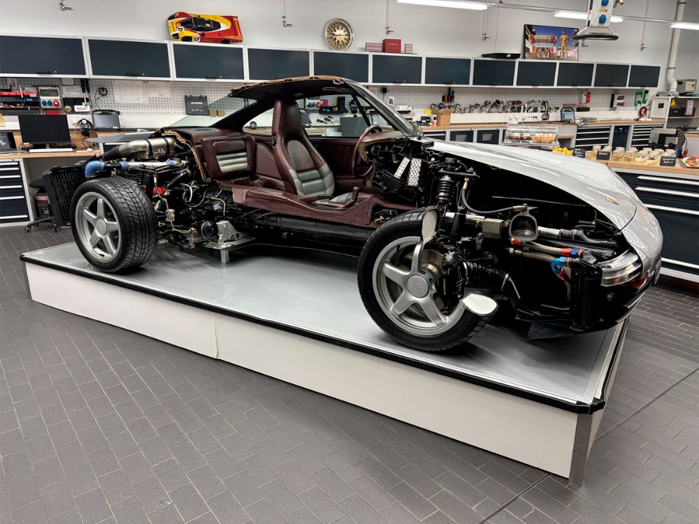 Vzduchem chlazený šestiválcový motor s protilehlými válci se dvěma turbodmychadly KKK s chladiči stlačeného vzduchu vzadu napříč, vodou chlazené hlavy válců, osmkrát uložený klikový hřídel, 4V DOHC (řetěz), hrníčková zdvihátka. Elektronické vstřikování Bosch Motronic. 2848 cm3 (ø 95 x 67 mm), 8,3:1. 330 kW (450 k)/6500 min-1 a 500 N.m/5500 min-1.