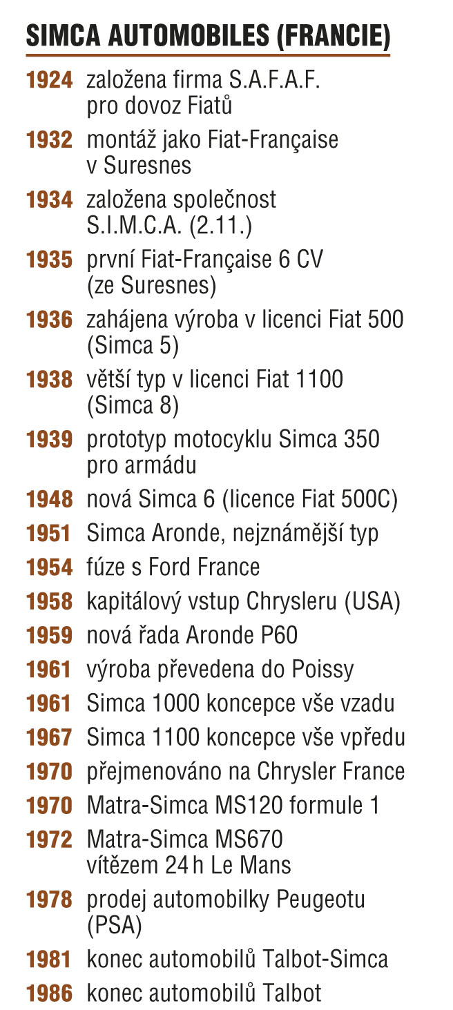 Málokterá automobilová značka ze zemí západní Evropy pronikla na náš trh v době tzv. socialismu, ale francouzská Simca k nim patřila a získala si v Československu značnou popularitu. Ačkoli po roce 1981 zanikla, automobily Simca jezdily po našich silnicích ještě dlouho poté a dodnes jsou chloubou pečlivých českých renovátorů a sběratelů... Málokdo ví, že libozvučné jméno Simca je vlastně S.I.M.C.A., tedy zkratkou Société Industrielle de Mécanique et Carrosserie Automobile, tedy Průmyslové společnosti strojírenské a automobilových karoserií, založené Henrim Theodorem Pigozzim (narodil se jako Teodoro Enrico Pigozzi 26. června 1898 v italském Turínu), který už před druhou světovou válkou po dohodě s Giovannim Agnellim zahájil montáž automobilů Fiat pro francouzský trh v Suresnes u Paříže (vznikl S.A.F.A.F., tedy Société Anonyme Française des Automobiles Fiat).