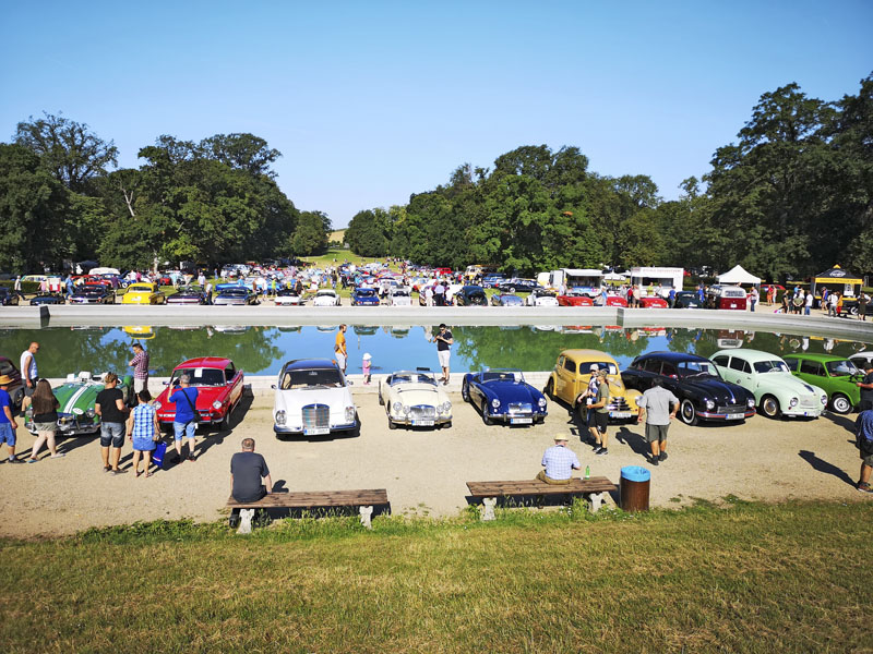 Překrásná zahrada zámku v kombinaci se slunečným, nikoli však parným počasím připravila kulisy k divadlu, jež se nikdy neomrzí. Před průčelím zámku návštěvníky vítala zřejmě ta nejhodnotnější část sbírky historických automobilů BMW pana Vránka (Renocar), navazovalo pódium nabízející po celou sobotu bohatý doprovodný program. Kolem hlavní kašny se, stejně jako kdysi, soustředily nejstarší a nejcennější automobily, v okolí postranních jezírek pak motocykly. Pod úrovní hlavní plochy směrem ke golfovému hřišti pak již bez většího ladu a skladu parkovaly stroje novější. Registrováno bylo nakonec celkem 1150 vozidel, o více než 100 více než loni, nicméně další do areálu najížděla ještě kolem poledne, tedy dávno po ukončení sčítání. Vstupné je výrazně nižší, než bylo v dobách Oldtimer Festivalu.