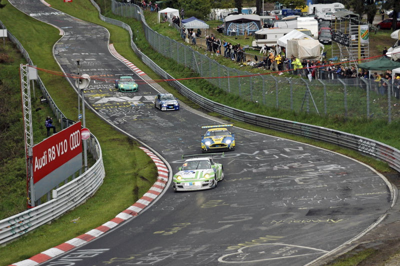 Největší závod na Nürburgringu, tom pravém, tedy zahrnujícím proslulé zelené peklo Nordschleife, kde byla formule 1 dávno zrušena po těžké havárii Nikiho Laudy v roce 1976, se letos jel pojedenačtyřicáté. Severní smyčka je pro čtyřiadvacetihodinovku propojena s novým okruhem Grand Prix, takže jedno kolo oficiálně měří 25 378 metrů. Samotná Nordschleife má 33 levých a 40 pravých zatáček, stoupání až 17 % a klesání do 11 %, výškový rozdíl činí rovných tři sta metrů. Stejně jako druhé dvě čtyřiadvacetihodinovky Le Mans a Spa-Francorchamps procházela vývojem od závodů cestovních automobilů po sportovní prototypy a vozy GT, zpočátku byla ovšem jen národní záležitostí. Od konce osmde-sátých let se mezi vítězi začali objevovat závodníci, jejichž mateřštinou není němčina, ale také vzrůstal oficiální zájem výrobců i prestiž tohoto podniku, jenž se pořádá na dnes už ojedinělé přírodní trati...