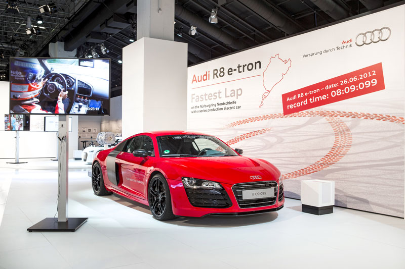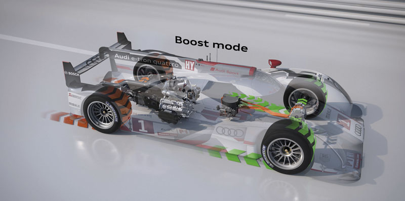 Vpředu je umístěn synchronní motor, který přes dvoustupňovou převodovku a diferenciál se závěrem pohání přední kola. Novinkou je přepínací vysokonapěťová elektrická palubní síť, kde oba akumulátory mají různá výstupní napětí 148 a 222 V. Stejnosměrný měnič DC/DC reguluje i vyžadované jednotné napětí systému, takže v dílčím zatížení to je z hlediska účinnosti asi 200 V, se zvyšujícími se nároky na výkon napětí stoupá až na 440 V. Hmotnost vozu F12 se pohybuje kolem 1650 kg, zrychlení 0 – 100 km/h zvládá za necelých 7 sekund, největší rychlost je omezena na 180 km/h a dojezd činí asi 200 km. Zbývá dodat, že se technologie e-tron objevila i na závodní dráze. V roce 2012 debutoval typ Audi R18 e-tron Quattro v závodech sportovních prototypů WEC (viz AR 5 a 8/’12). Kola jeho zadní nápravy pohání vznětový motor 3.7 V6 TDI o výkonu přes 375 kW (510 k) a točivém momentu 850 N.m prostřednictvím šestistupňové sekvenční převodovky. Na přední nápravě umístěná jednotka motor/generátor MGU při brzdění přeměňuje získanou energii na stejnosměrný proud po roztočení setrvačníku až na 45 000 min‑1 ve vzduchoprázdném prostoru skříně. Tuto akumulovanou energii může řidič opět využít při výjezdu ze zatáčky, kdy elektromotory jednotky MGU 2x 75 kW krátkodobě pohánějí přední kola (dobu a způsob aktivace určují sportovní řády FIA). Jako vítěz závodu 24 h Le Mans 2012 byl typ R18 e-tron Quattro nejen rychlejší, ale také hospodárnější. Spotřeboval o 10 procent méně motorové nafty než o rok dříve vítězný Audi R18 TDI s klasickým uspořádáním pohonu zadních kol.