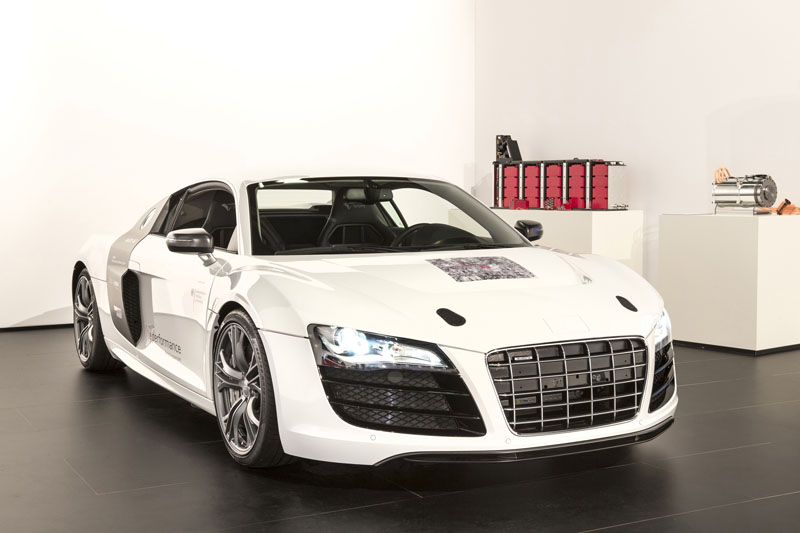 Pozoruhodný prototyp Audi e-tron Spyder, navržený rovněž jako Plug-In Hybrid, má pohon všech kol uspořádán poněkud jinak. Jeho vznětový šestiválec 3.0 V6 TDI/ 221 kW (300 k), 650 N.m, s dvojicí plnicích turbodmychadel je uložen uprostřed vzadu a pohání zadní kola. Těm v kratších intervalech může vypomáhat dvojice elektromotorů pohonem kol předních (celkem 64 kW, 352 N.m). Potřebnou energii získávají při brzdění prostřednictvím akumulačního systému, jenž využívá kinetickou energii setrvačníku (jako v závodním prototypu Porsche 911 GT3 R Hybrid, viz AR 12/’10). Pro provoz hlavně v městských aglomeracích je navržen Audi A1 e-tron s prodlužovačem dojezdu Range Extender, tvořeným malým spalovacím motorem a generátorem.