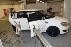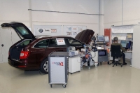 Druhou částí exkurze byla prohlídka zkušebny vývoje elektroniky a řídicích jednotek (ŘJ). Ke klíčovým úlohám tam patří komunikace, funkce a odolnost ŘJ; provádějí se zkoušky všech kombinací výbav (i identických sestav, avšak od různých výrobců). Zaujal nás malý robot KUKA, jenž provádí automatické zkoušky ovládání autorádia (např. 10 000 cyklů vyjmutí a vložení CD!), automatizace je nutná vzhledem k časové náročnosti. Kuriozitou jsou zkoušky diagnostiky vozu D-FIT, kdy probíhá řízené vyhledávání závad pro určení optimální cesty k jejich zdroji. Novinkou je zkušebna parkovacích čidel (dosah, citlivost), které využívají ultrazvuku, jehož šíření (odraz) je závislé na teplotě, vlhkosti a druhu povrchu. Plný tón se nastavuje na vzdálenost cca čtvrt metru, dosah na 1,4 až 1,6 metru, standardní překážkou je sloupek průměru 75 mm a výšky 1000 mm. Čidla se aktivují tlačítkem, anebo zařazením zpátečky (Škoda Auto je využívá jen vzadu). Fotometrická laboratoř slouží testování světlometů včetně simulace noční jízdy. Zkoušky pro konstrukci vozů zahrnují otevírání a zavírání bočních dveří (až sto tisíc cyklů), stahování okenního skla (třicet tisíc cyklů), statické zkoušky zatěžování karoserií a jejich částí (zajímavá je speciální rovná a tuhá podlaha zkušebny s kotevními otvory pro upevnění testovaných vzorků).