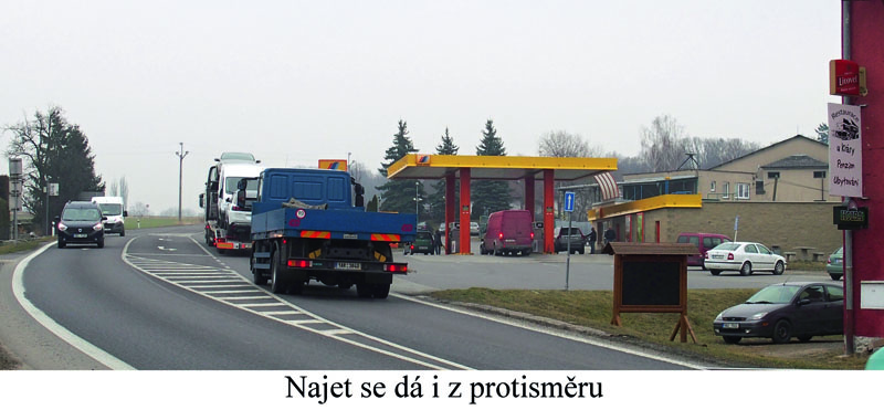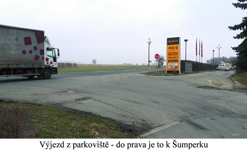 Zhruba 300 metrů za křižovatkou, vpravo od silnice je parkoviště pojmenované podle ulice; je jednosměrně průjezdné a není velké, ale v nutném případě se vejde i nějaký ten náklaďák. Na parkoviště navazuje dvoustojanová čerpací stanice s prodejnou obvyklého sortimentu motoristických potřeb a lehkého občerstvení. Následuje výdejní místo LPG a pak vysavač a kompresor. Pro krátkodobý odpočinek je tam venkovní posezení. S parkovištěm přímo sousedí restaurace se zajímavým interiérem a bohatým jídelníčkem a také penzionem s levným ubytováním v patře nad restaurací. Výjezd z parkoviště je do kopce, přímo do jízdního pruhu, a proto je opatřen dopravní značkou P6 Stůj, dej přednost v jízdě!