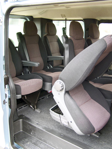 Prostor pro cestující byl vybaven dvěma řadami tří samostatných sedadel s opěrkami rukou, opěrkami hlavy a bezpečnostními pásy. Každý cestující tak měl dostatek prostoru jak na nohy, tak i na šířku a odpovídající prostor nad hlavou. Potahy z hrubé látky dobře drží tělo v zatáčkách, otázkou je jejich údržba. Sedadla jak v třetí tak i v druhé řadě jsou samostatně sklopná i vyjímatelná. Opěradla prostředích sedadel pak nabídnou po sklopení praktický stolek s vybráním pro dva kelímky s nápojem. Když není vozidlo plně obsazeno, jistě to je příjemná varianta. Okna lze pootevřít posunem. Cestující na svá místa nastupují širokými posuvnými dveřmi na pravé straně vozidla. Za druhou řadou sedadel, krytý vyjímatelným platem, je zavazadlový prostor o rozměrech 500 x 1350 x 900 mm. Nicméně pod prostředním sedadlem druhé řady je ještě místo pro uložení delších předmětů, třeba lyží. K zavazadlovému prostoru je velmi dobrý přístup zadními symetricky dělenými křídlovými dveřmi.