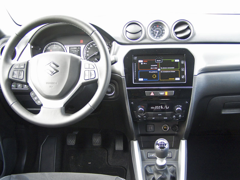 Suzuki Vitara v ceníku začíná se zážehovým motorem 1,6 VVT s pohonem 4x2 na ceně 386 700 Kč s výbavou Comfort. Vitara se vznětovým motorem a pohonem všech kol a s výbavou Premium atakuje cenu 536 900 Kč, testovaný vůz měl výbavu Elegance, takže cena byla 567 650 Kč s DPH. Na vrcholu nabídky je stejný motor doplněný samočinnou převodovku 6TCSS s pohonem všech kol a výbavou Elegance Panorama v ceně 651 900 Kč. K testu jsem převzal Vitaru s černým základním lakem a bílou střechou. Někdo je z této kombinace nadšený, já bych pro docela kompaktní vůz volil „veselejší“ barvu. Ale musím uznat, že vozidlo vypadalo elegantně a sedmnáctipalcové lité disky mu slušely. Takže docela pěkné auto s ostře řezanou čelní partií. Mírně krabicovitý tvar karoserie signalizuje, že by uvnitř mohlo být i dost prostotu. Pravdou je, že Vitara je homologována jako pětimístná, ale pohodlné cestování si v ní užijí pouze čtyři dospělé osoby. K tomu mají za zády relativně mělký zavazadlový prostor (cca 375 l), pod jehož podlahou (ale podlahová deska je vyjímatelná a nastavitelná do dvou výšek) je ještě jedno patro, kam můžete úspěšně uschovat drobnější věci, které není dobré příliš vystavovat. A pod touto „falešnou“ podlahou je ještě druhý suterén, kde je v polystyrenovém výlisku uložena předepsaná výbava a opravná sada s kompresorem. Raději bych zde viděl alespoň dojezdovou rezervu.