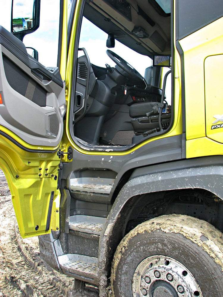 Po běžném rituálu nastavení sedadla, volantu a zrcátek stačí zapnout bezpečnostní pás, volič převodovky nastavit do polohy N a s nohou na brzdovém pedálu spustit motor. Rozjezd s volitelným režimem „Off Road“ na stupeň 2 je snadný, stačí přepnout volič do polohy D a přidat „plyn“. Řazení je téměř neznatelné, přestože k němu v terénním režimu dochází při vyšších otáčkách motoru. Tlačítkem na voliči převodovky lze její samočinný režim změnit na manuální, což jsme s úspěchem použili v úsecích, kde bylo nutné využít dynamické energie jedoucího vozu. Jeden z předváděcích vozů byl vybaven příplatkovým hydropohonem přední nápravy Paul PXP, který, přestože na voze byly jen běžné silniční pneumatiky, nebylo nutné ani v těch nejhorších úsecích aktivovat. Kupodivu nebylo také v rozmáčeném a blátivém terénu hliníku potřeba použít závěry nápravových diferenciálů. Na silnici jsme ocenili velmi účinnou dekompresní motorovou brzdu MX EB, jež spolehlivě řeší všechny běžné provozní situace. Poslední verze brzdového systému AEBS-3 je schopna zajistit nouzové brzdění z rychlosti až 80 km/h. Standardní výbavou je adaptivní ACC a prediktivní PCC tempomat udržující nastavenou rychlost a odstup od vozidla vpředu. Příplatkový systém City Turn Assist detekuje účastníky silničního provozu nebo objekty na straně spolujezdce. Jízdu vozu v jízdním pruhu hlídá Line Assist.