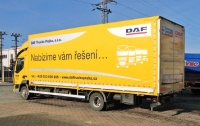 Tolik krátké seznámení s interiérem. Usedám za volant, seřizuji sedadlo, upravuji výšku volantu a otáčím klíčkem v zapalování. Krátké žhavení (v noci mrzlo) a motor se s chutí rozbíhá. Ještě seřídit zrcátka (elektricky), nastavit ofukování čelního skla a zapnout předepsané osvětlení. Řadím první rychlostní stupeň a zvolna manévruji ven z obležení trucků na parkovací ploše dovozce. Testovaný DAF LF má na tachometru natočeno něco přes 700 km, takže je ještě zcela „syrový“ a řazení jde docela ztuha. Mířím nejprve na dálnici D1 směr Brno, potom odbočuji v Mirošovicích na silnici I/3 a zvlněnou krajinou s táhlým stoupáním u Votic „uháním“ k Táboru. Na ložné ploše je jen symbolická dvoutunová zátěž, takže zadní náprava neodskakuje. Provozní hmotnost vozidla je 5635 kg + 2000 kg zátěže, takže ještě můžu naložit více jak 3000 kg. Nebýt hustého provozu, vlastně bych ani nemusel často řadit. Včetně zdolání „votičáku“ bych si vystačil se třemi nejvyššími rychlostními stupni. A to omezovač byl nastaven na 90 km/h. V Táboře na kruhovém objezdu otáčím a vracím se zpět na Prahu. V klesáních využívám odlehčovací brzdu a za Benešovem odbočuji na „starou benešovskou“, tj. na silnici II.třídy plnou zatáček a stoupání. I zcela syrový motor si vede velmi dobře. Interiér kabiny je solidně odhlučněn a dokonce se v průběhu jízdy o něco zmenšila tuhost řazení. Při manévrování u rampy v průmyslové zóně si znovu uvědomuji, jak velký je u tohoto podvozku zadní převis valníkové nástavby. To by opravdu nebylo vhodné pro rozvážku do města.