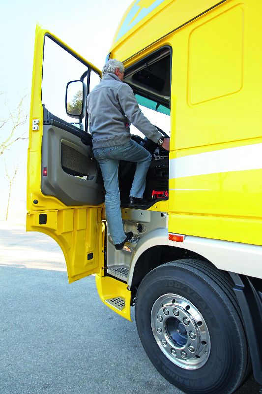 Na vozovkách s nekvalitním povrchem jsou ve volantu patrné více či méně silné rázy. S nasazeným výměnným kontejnerem a při plném využití nosnosti je u vozu s touto konfigurací podvozku patrná určitá nechuť k zatáčení – vlastnost, kterou návěsové tahače XF neznají. Může to však zčásti jít i na vrub předních plášťů o šířce 385, které jsou vzhledem k přípustnému zatížení nápravy vlastně zbytečné.Vydařené je uložení kabiny. Rám třínápravového tažného vozidla BDF působí stabilněji než u návěsového tahače. Vlastní pohyby kabiny řidiče s vysoko položeným těžištěm jsou menší, než je tomu u návěsového tahače. Výhled z kabiny je v zásadě dobrý. Na straně spolujezdce však sám o sobě štíhlý A-sloupek vytváří spolu s nevhodně umístěným vodítkem okna a masivním vnějším zpětným zrcátkem téměř neproniknutelnou bariéru. Plus: všechna čtyři hlavní zpětná zrcátka může řidič seřizovat elektricky. Dolů protažená sluneční clona omezuje výhled na nízko umístěné semafory.