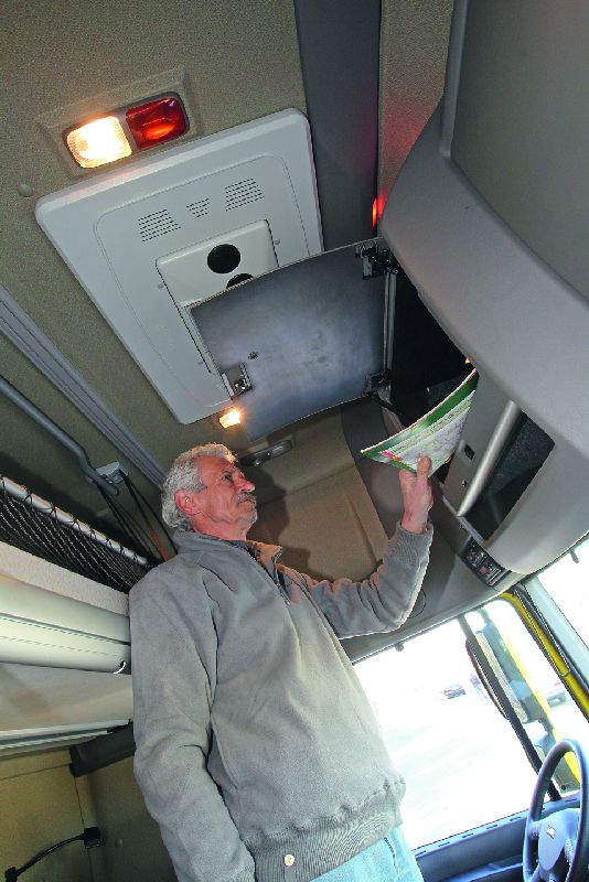 Absence střešního větracího otvoru tolik nebolí, protože prodejce kabinu vybavil účinnou stabilní klimatizací nabízenou jako příslušenství. Příplatek za Super Space Cab je rovněž nastaven výhodně: Přibližně o 180 litrů větší úložný prostor, více volného prostoru nad hlavou na lůžku a výška ke stání přes dva metry hovoří proti Space Cab. Velkoryse dimenzovaná lůžka nabízejí délku 2,0 resp. 2,1 metru (šířka lůžka nahoře/dole: 70/80 cm).Pružné rošty lůžek a vysoké matrace zajišťují vysoký komfort spánku. Seřizovací rozsah sedadla i volantu je velkorysý. Sedadla „Super-Air“ jsou drahá, pokud však hledáte maximální komfort jízdy, mají smysl. Výšková aretace horního lůžka slouží zároveň jako držák ručníků. Chybějí řádné držáky plechovek a šálků. Šedý interiér a stříbrné přístroje testovaného nákladního vozu působí lacině. Počet přístrojů je zvolen minimalisticky, některá tlačítka nejsou vidět. Osvětlení vnitřního prostředí a xenonové reflektory nejsou bezpodmínečně nutné. Zrcadlení v osvětlených přístrojích je minimální.
