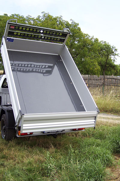 Málem bych zapomněl na nástavbu. Elektrické čerpadlo hydrauliky zvedání se sice ovládalo na dostatečně dlouhém kabelu upevněným zcela jednoduchým tlačítkovým ovladačem, ale nejdříve bylo nutné na rámu pod vozidlem bezpečnostním klíčem zapojit elektrický okruh. Korba sklopná do tří stran se sklápí docela svižně. Její součástí je ochranné čelo za zadním sklem kabiny, které je v horní části upraveno na upevnění třeba dlouhých přepravovaných předmětů, trubek, žebříků apod. Na podlaze korby je pak šest robustních jisticích ok. A vlastně ještě jednu část příplatkové výbavy jsem neměl možnost vyzkoušet. Na konec rámu bylo připevněno standardní tažné zařízení ISO 50 (koule), umožňující připojit brzděný přívěs o hmotnosti 2500 kg.