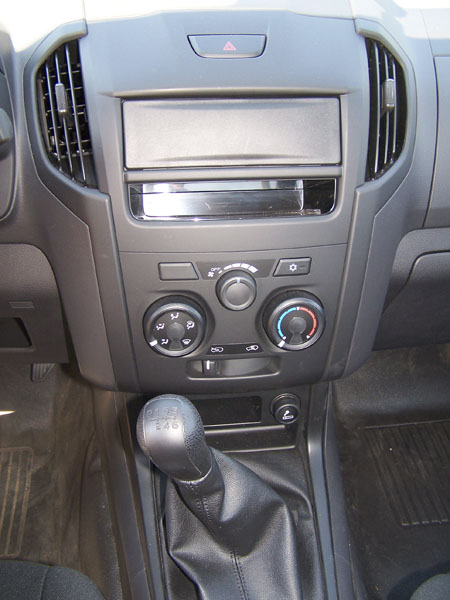 K redakčnímu testu přijel klasický dvoumístný pick-up, tj. D-Max Single Cab Basic s obrovskou korbou se zadním sklápěcím čelem. Standardní výbava byla doplněna o plastovou vanu chránící korbu před poškozením, a nechyběl ani držák umožňující na jedné straně přepravu dlouhých předmětů, na straně druhé částečně ochraňující zadní sklo kabiny. Ačkoliv budka je pouze dvoumístná (o to větší je ale nákladový prostor), řidič i spolujezdec mají v kabině opravdu dostatek prostoru a ještě zbývá za sedadly místo na předepsanou výbavu či nějaké drobnější nářadí. Z hlediska ergonomie je palubní deska přehledná, všechny spínače i ovladače dobře dostupné a potěší, že i základní výbava má výškově seřiditelné pásy. Na čistě pracovním off-roadu výrobce nešetřil airbagy, je jich namontováno celkem 6. Pokud jde o výbavu, nechybí možnost výškově seřídit volant (i pro moji dvoumetrovou postavu dostatečně), boční okna mají elektrické ovládání, ovšem zpětná zrcátka se seřizují manuálně. Standardem je jednoduchá manuální klimatizace a možnost přepnutí na vnitřní cirkulaci vzduchu. Autorádio už patří do příplatkové výbavy, nicméně je zde tzv. před-příprava na jeho montáž, tj. kabeláž a anténa. Před spolujezdcem jsou dvě uzavíratelné schránky, horní spíše na nějaké drobné věci a papíry, spodní je rozměrnější. U testovaného vozidla byl mezi sedadly ještě praktický malý box s dostatečně velkým úložným prostorem. Ve dveřích nechybí velké kapsy s prostorem pro PET lahev. U levého kolene je spínač umožňující vypnout ESP, pod řadicí pákou na středové konzole je pak otočný volič konfigurace pohonu. Základem je 2H, tj. pohon zadních kol, 4H – připojení pohonu i předních kol a konečně 4L je pohon všech kol s redukcí. Vše přehledné, jednoduché a troufám si říci i „blbuvzdorné“.