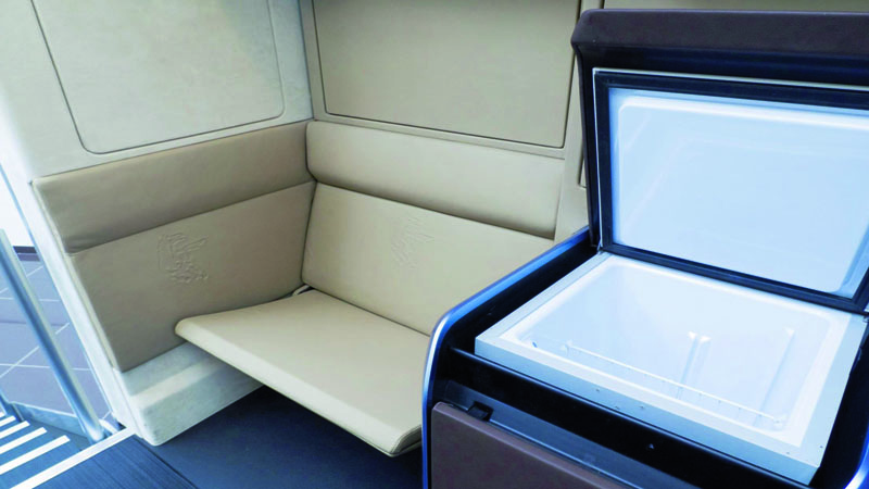 Prostor pro přípravu jídla je vybaven nejmodernějšími komponenty. Indukční varná deska disponuje dvěma varnými plochami, je samozřejmě sklápěcí a lze ji kompletně „schovat“ do zadní stěny kabiny. Pokud řidič cítí potřebu rychlého občerstvení, může využít mikrovlnou troubu. Ve společnosti Torino Design pracují především italští návrháři, není se tedy co divit, že nemalý důraz kladou na příjemná rána se správným espresem. Proto naleznete ve studii Kamaz 2020 přístroj na výrobu tohoto skvělého nápoje, který je doslova symbolem Itálie po celém světě. Protože je třeba opravdu optimalizovat využití vnitřního prostoru kabiny, jsou všechny přístroje a zařízení uloženy tak, aby je bylo možno skrýt v zadní stěně. Protože je třeba také odpočívat, je řidiči k dispozici výklopný gauč, z něhož lze jako v pohodlí domova sledovat projekci filmu či se dívat na 24 palcovou televizní obrazovku. V okamžiku, kdy dojde na spánek, stačí pouhým stiskem příslušného tlačítka „stáhnout“ ze stropu rozměrné lůžko. Důležitou součástí života je pohyb a regenerace. Unikátním zařízením v interiéru kabiny trucku je běžecký pás, jenž je možno využít k joggingu, pokud této aktivitě brání počasí či jiné podmínky panující vně tahače.