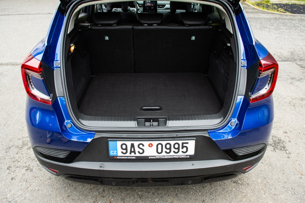 Platí to také o interiéru, jenž je opět dokonale shodný s francouzským crossoverem. Ve srovnání s minulou generací typu ASX to ale znamená významný skok vpřed. Materiály jsou daleko kvalitnější, interiér je hezčí a dojem rovněž vylepšuje digitální přístrojový štít v kombinaci s poměrně velkým středovým dotykovým displejem. Všechny výbavy s výjimkou testovaného vrcholu nabídky disponují multimediálním systémem s dotykovým sedmipalcovým displejem, úroveň Instyle pak má 9,3palcový displej s navigací. Digitální přístrojový štít je dostupný od úrovně Intense, ovšem v menší sedmipalcové verzi. Desetipalcové provedení je opět výsadou nejvyšší výbavy. Nechybí řada odkládacích přihrádek, bezdrátové nabíjení telefonů, rozumné množství fyzických tlačítek a potěší i standardně dodávaná posuvná zadní lavice. Podle našeho měření činí rozsah posuvu 16 cm. Dvojité dno prostoru pro zavadla je dodáváno bez příplatku od druhé úrovně výbavy.