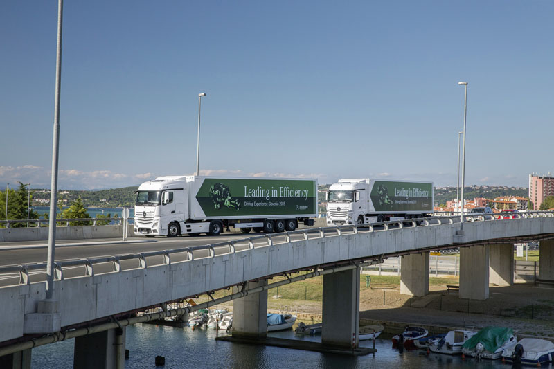 Proto proběhly testy motorů nejprve na dvacet let staré testovací trase ze Stuttgartu do Hamburku a poté ze slovinské Lublaně do přímořského letoviska Portorože v délce 130 km. Nejprve jsme jeli v městském provozu ve slovinském hlavním městě Lublaně a poté po dálnici k moři. Nejprve jsme zkusili manuální systém a poté byl na dálnici využit inteligentní tempomat Predictive Powertrain Control (PPC). Po rovině a z kopce jsme jeli rychlostí 83 km/h., do kopce 75 km/h a z kopce až 89 km/h. Tahač o hmotnosti 18 tun měl zapojen návěs s nákladem o hmotnosti 40 tun. Testovaný tahač Actros 1848 LS 4x2 měl motor OM 471 o maximálním výkonu 350 kW/1800 min-1. Velmi členitá testovací trasa nedělala tahači žádné problémy, plynule přecházel do stoupání i klesání a hlučnost byla minimální. Motor má slušnou akceleraci při rozjezdech i jízdě na rovném úseku. Celková spotřeba na 130kilometrovém úseku vyšla na 29,5 litrů/100 km. Lze také konstatovat, že se zlepšila jízdní dynamika díky vyššímu točivému momentu.
