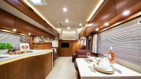 Vykachlíkovaná a vyhřívaná podlaha, nábytek s doplňky z překližky z americké višně v obytném prostoru a rozměrná ložnice s obklady připomínajícími pískovec. Pracovní deska v kuchyni a podlaha v koupelně jsou vyrobeny z umělého litého kamene a sófa má tu nejjemnější kůži. Jednoznačně lze říci, že pouhý „interiér“ kemperu se v této podobě změnil na tzv. „dreamteriér“. Kempinkový vůz od společnosti Vario Mobil se sídlem v Bohmte blízko Osnabrucku je mistrovským dílem, které korunují dřevěné reliéfy na stěnách koridoru vedoucího ke koupelně v podobě osvětleného skleněného kabinetu. Hydraulicky ovládané segmenty bočních stěn dokáží rozšířit dvanáct metrů dlouhý a čtyři metry vysoký interiér obytného pokoje a ložnice na více než komfortní byt na kolech. Palubní technika je stejně vzrušující jako nábytek. Dvě ploché televizní obrazovky s uhlopříčkou 32 palců, parní trouba, indukční varná deska, centrální vakuový vysavač, automatická pračka a sušička – a to není všechno. Pro nezávislé cestování je třeba dostatek energie, proto je podvozek vybaven bateriemi o celkové kapacitě 1200 Ah, systémem solární elektrárny, generátorem a invertorem s výkonem 6000 W. Nádrže pojmou 390 l motorové nafty a 500 l pitné vody. V garáži v zadní části vozu je umístěn malý sportovní Mercedes-Benz SLK. Třínápravový podvozek Antos 2543 L (315kW/428 k) má pneumatické odpružení a plně vybavenou úzkou kabinu typu M. Stejnou nástavbu lze montovat též na podvozky řady Actros.