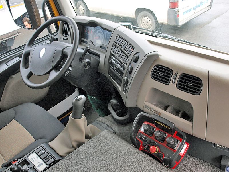 Ačkoliv v nabídce výrobce je i automatizovaná převodovka, v testovaném vozidle byla „klasika“, tedy přímo řazená 16stupňová převodovka se systémem řazení Range & Split vybavená akustickým signálem upozorňujícím méně zkušeného řidiče na nutnost přeřazení na vyšší, resp. nižší rychlostní stupeň. U testovaného Landeru pracovala bezchybně, její ovládání bylo přesně a přiměřeně tuhé. Výbavu pracoviště řidiče vizuálně doplňovalo dálkové ovládání hydraulické ruky Palfinger, které našlo své odkládací místo mezi krytem motoru a palubní deskou. Bylo tam relativně pevně uchycené, a přitom dostupné pro řidiče i případného závozníka.