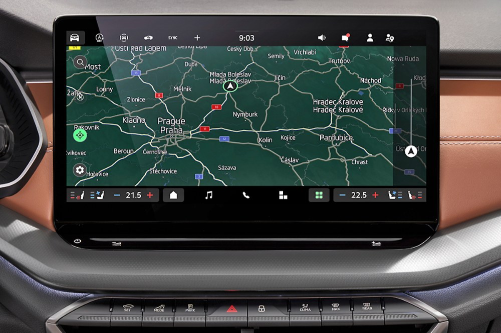 Z uživatelského pohledu je ale zřejmě zásadnější proměnou použití nové generace palubní elektroniky a displejů, protože právě infotainment byl jednou z největších slabin Octavie před modernizací. Nyní jsou standardem digitální přístroje s novými možnostmi zobrazení a grafikou, ale především centrální palubní jednotka s úhlopříčkou 10 nebo 13 palců. Během prvních testů jsme měli k dispozici výhradně nejvyšší verzi nového systému, který má upravenou domovskou obrazovku a do horní lišty přidal možnosti vložení tlačítek přímého přístupu k individuálně zvoleným funkcím. Ve spodní části jsou napevno umístěny ikony přímé volby hlavních funkcí a také obsluhy standardně dodávané dvouzónové klimatizace.