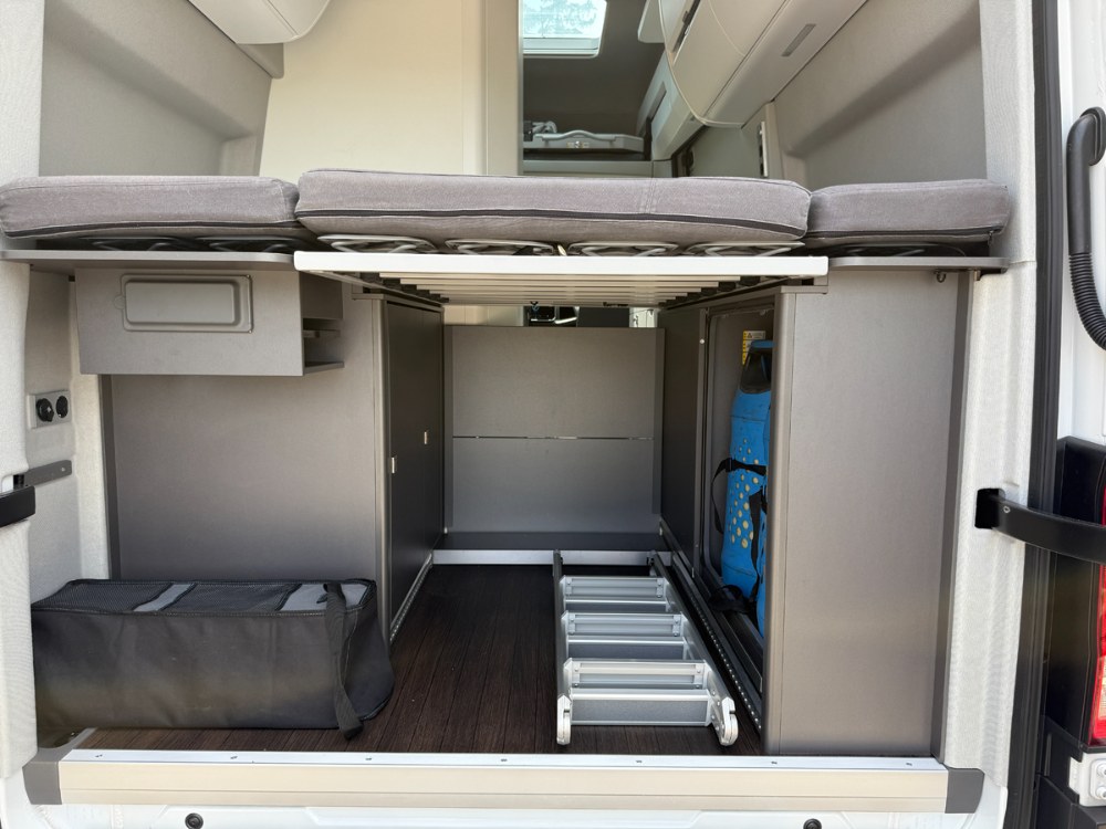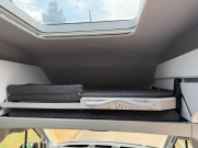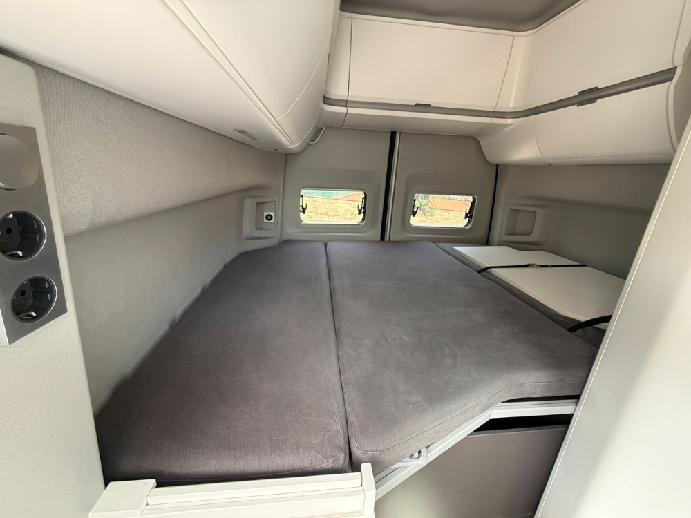 Zadní postel s děleným roštem a plastovými pružinami má rozměry 1930 × 1360 mm (výrobce připouští toleranci cca 3,5 cm). Vyšší osoby nad 185 cm proto musí spát lehce šikmo. Pro větší komfort a délku postele slouží mírná vyboulení v bočních částech vozu. Matrace jsou velmi kvalitní, byť poměrně tvrdé – milovníci měkčího ležení mohou být překvapeni.