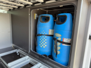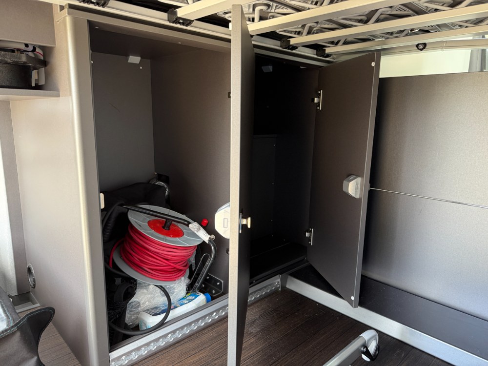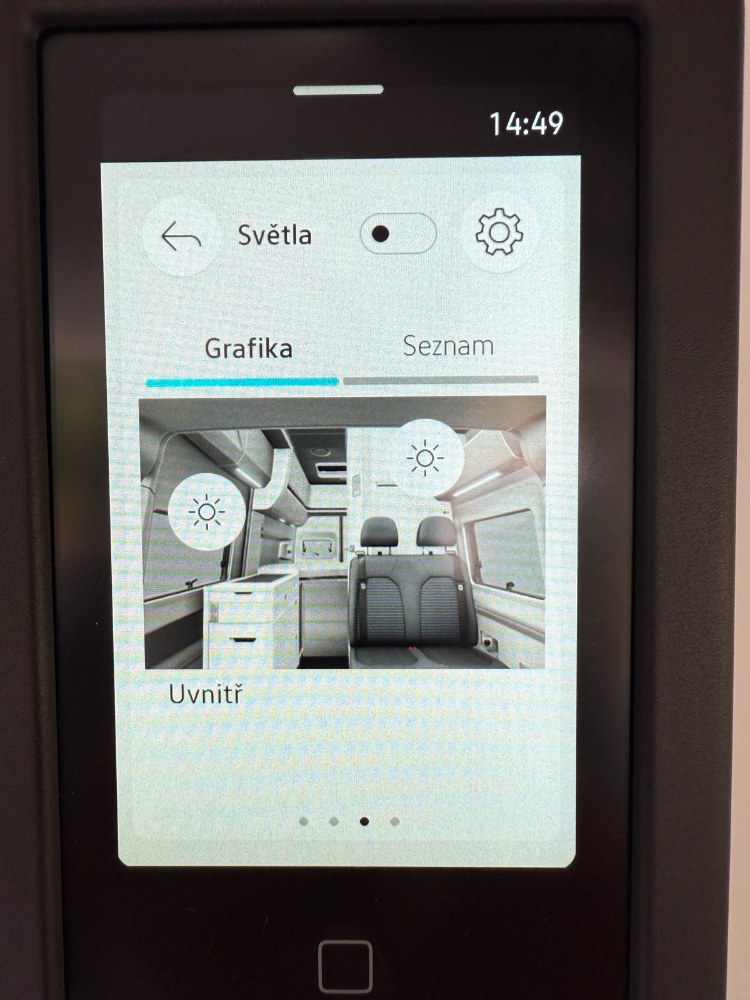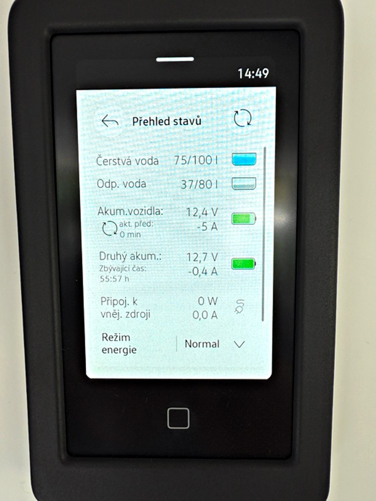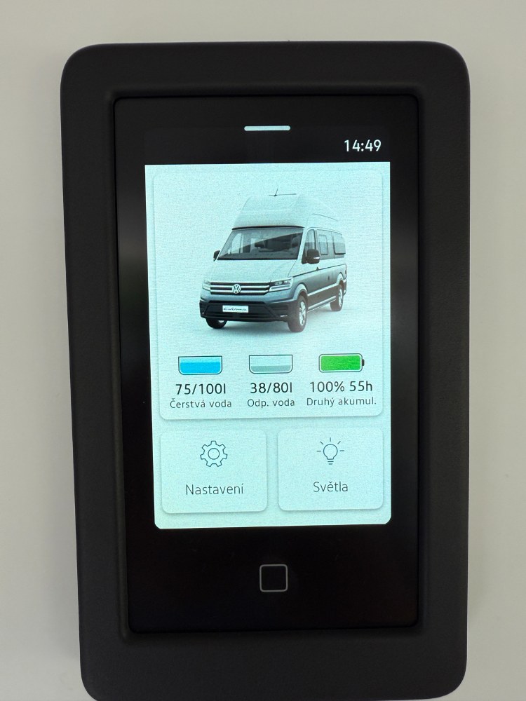 Na stěně koupelny je dotykový ovládací panel připomínající mobilní telefon. Tento „centrální mozek“ zobrazuje množství čisté a odpadní vody v nádržích i stav akumulátoru pro obytný prostor. Přes tento panel se ovládá topení a vnitřní i vnější osvětlení. Druhý, jednodušší displej pod dvousedačkou slouží k ovládání nezávislého topení. Jeho rozhraní je méně intuitivní, protože používá pouze symboly namísto textu.