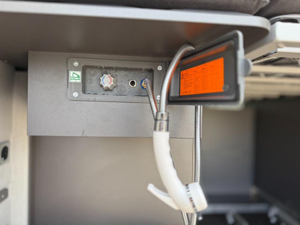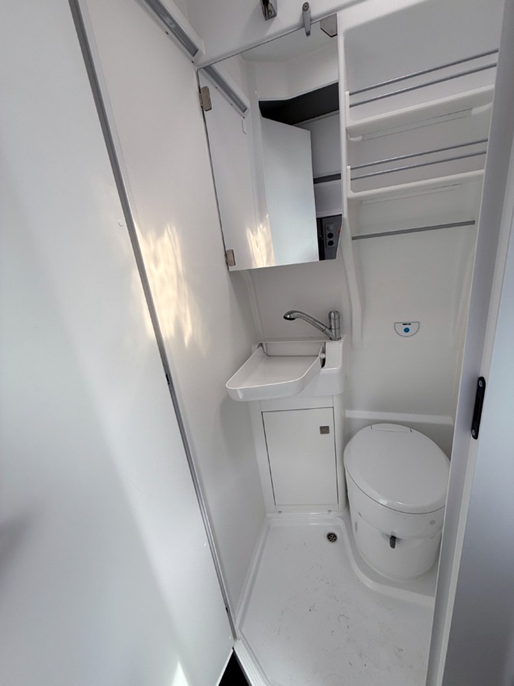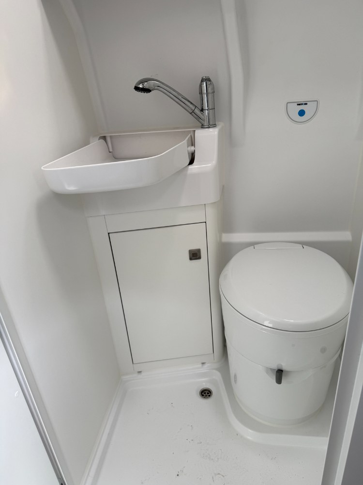Sériově je vůz vybaven i sprchovacím koutem s toaletou a sklopným umyvadlem. Tato kompaktní jednotka (840 × 800 mm) se nachází za druhou řadou sedadel a je navržena velmi prakticky. Na stropě je střešní ventilační okénko se síťkou proti hmyzu, nechybí ani zrcadlová skříňka a úložné přihrádky. Otočná toaleta může být volitelně doplněna systémem SOG pro aktivní odvětrávání, který při splachování vytváří podtlak a eliminuje zápach. Díky tomu není nutné používat chemii v odpadové kazetě o objemu cca 18 litrů. Ta je přístupná zvenčí a pro snadnou manipulaci vybavena kolečky. Odpadní („šedá“) voda z kuchyně a koupelny se shromažďuje v 90litrové nádrži pod podlahou a vypouští se jednoduchým otočením ventilu.