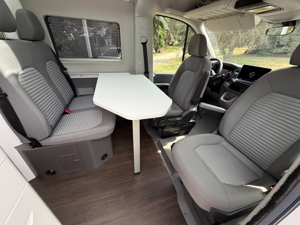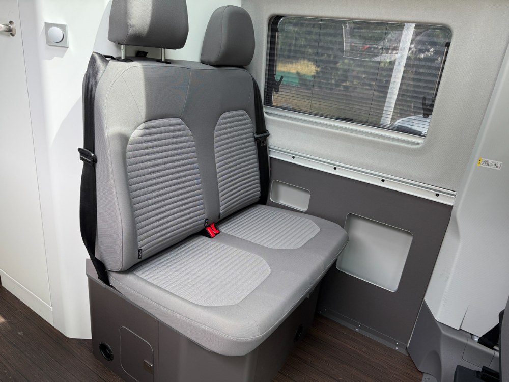 Druhá řada sedadel tvořená dvousedačkou nabízí poněkud omezený prostor a je vhodnější spíše pro děti. Problém nastává, jestliže máte dvě větší dětské autosedačky – vedle sebe se nevejdou. Chybí zde možnost děleného sezení, jakou známe z dálkových autobusů. Takové řešení by sice zvýšilo cenu, ale i komfort. Dvousedačka má navíc příliš vzpřímená opěradla bez možnosti nastavení sklonu. Proti tomu přední otočná sedadla s loketními opěrkami jsou pohodlná a snadno ovladatelná, při otáčení je však nutné narovnat opěradla, jinak se zaseknou o dveře. Mezi sedadly je dostatek místa pro pohodlný průchod do jídelní části, hodil by se zde odpadkový koš. Ten totiž ve voze chybí a musí jej suplovat například igelitová taška.