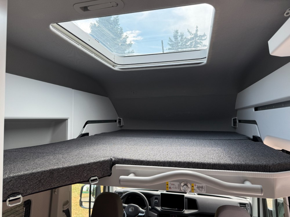 Základem je užitkový Volkswagen Crafter, díky čemuž je Grand California nabízena se dvěma rozvory a délkami. Testovaná kratší varianta 600 měří necelých šest metrů (5980 mm) a má rozvor 3640 mm. Delší verze dosahuje 6863 mm a rozvoru 4490 mm. Paradoxně pouze kratší verze nabízí čtyři místa k sezení i spaní. Pro čtveřici dospělých to však není ideální – horní výsuvné lůžko nad jídelnou (volitelně za 61 982 Kč) se hodí spíše pro děti nebo osoby menšího vzrůstu. Je dlouhé 1650 mm a na straně řidiče je lze prodloužit výklopným nástavcem.