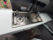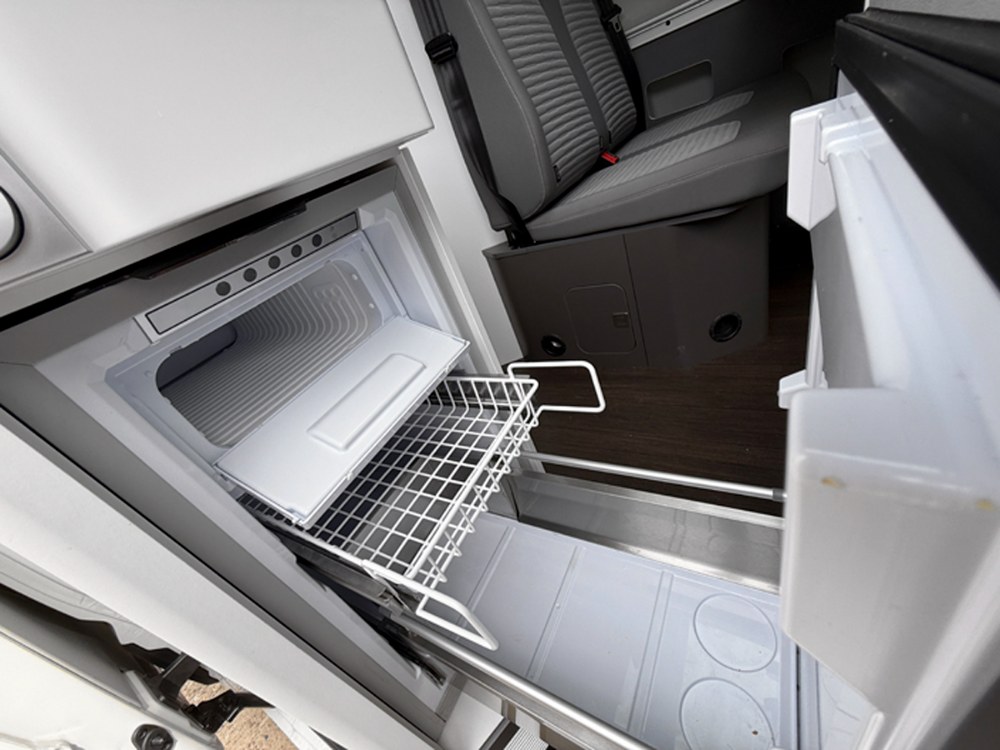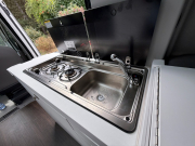 Součástí standardní výbavy je kuchyňský blok se dřezem, dvěma plynovými vařiči a lednicí s mrazákem. Nad vařičem a dřezem je výklopná skleněná deska, která může posloužit jako přídavná pracovní plocha. Tu lze rozšířit po obou stranách kuchyňského bloku. Pod umyvadlem se nachází několik prostorných skříněk, zatímco pod postelí je 110litrová nádrž na čistou vodu s plněním zvenčí. Lednička má objem 70 litrů a na šířku pojme i třetinková piva ve skle. Uvnitř je výsuvný kovový rošt, kam se dávají láhve a těžší potraviny, neboť lednička je poměrně hluboká a zbytečně vysoké zatížení jejího dna by mohlo zkřivit pojezdy. Mrazák je menší, ovšem na nanuky a maso bohatě stačí.