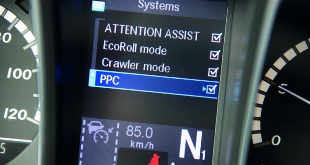 Ale pozor, máme zde přeci ten nový systém PPC, takže tomu je potřeba věnovat trošku pozornosti. Na centrálním displeji se samozřejmě zobrazí ikona pro aktivaci PPC. Před samotnou jízdou je třeba zvolit rychlostní okénko, v němž se může PPC pohybovat. Na vysvětlenou. PPC podle topografických dat rozezná stoupání a sjezdy, rozezná gradient a dokáže ovlivňovat vozidlo tak, aby dodržovalo nejen nastavenou rychlost, ale hlavně, aby jelo pokud možno úsporně. PPC dokáže dávat příkazy automatizované převodovce, aby změnila převod v rámci lepšího využití výkonové křivky motoru - a to dokonce i řazením přes dva stupně!