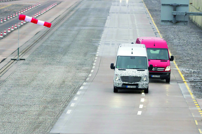 Tak to bylo jen takové intermezzo na úvod. Malá flotila Sprinterů již byla připravena. Při nastupování do vozidla mě prováděl výklad instruktora: „jde o světovou premiéru, ale vlastně jen v segmentu dodávkových vozidel, jinak Crosswind Assist, jak se systém asistence proti účinkům nenadálých poryvů bočního větru jmenuje, vřadil Mercedes-Benz již před několika lety do svých osobních automobilů vyšších tříd. Má to však jedno „Ale“… V osobácích funguje systém ve spolupráci s aktivním podvozkem, resp. s aktivním nastavování tlumičů, zatímco zde ve Sprinteru systém vychází z původního ESP tedy systému stability jízdy (v roce 2011 dostal stejný elektronický asistent největší mercedesí off road modelová třída GL). V okamžiku, kdy je třeba, aby vůz zareagoval, Crosswind Assist bleskurychle vyhodnotí klopný moment vznikající kolem těžiště na páse rovné vzdálenosti účinku poryvu větru od zmíněného těžiště a okamžitě zařídí příslušnou reakci, vyvolá protimoment přibržděním potřebného kola vozidla.“ Tak, tudy na to! Dodávka zkrátka v případě „napadení bočním větrem“ zpomalí a nestejnoměrné brždění kol ji přinutí zůstat víceméně ve zvolené jízdní stopě. Nu což, je čas na to si celou věc vyzkoušet.