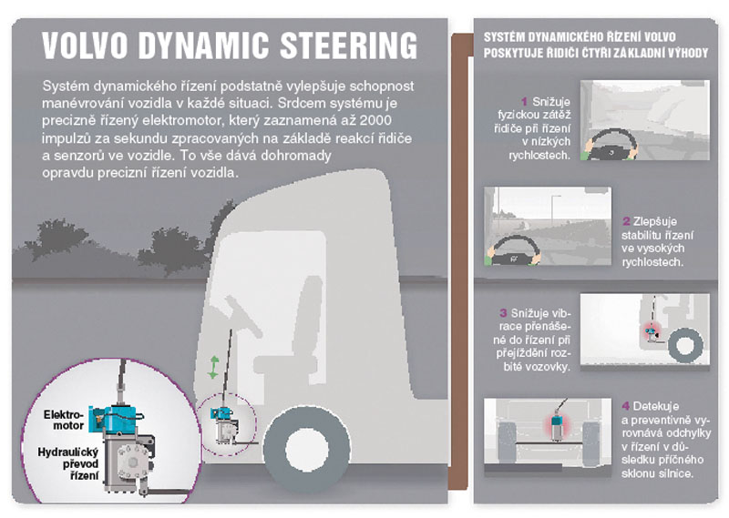 Systém spojuje běžný hydraulický posilovač řízení s elektronicky regulovaným elektrickým motorem napojeným na řídicí jednotku. Výsledkem je možnost přesného řízení, která řidiči vozidla přináší bezpečnější, pohodlnější a příjemnější pracovní prostředí. „Tato patentovaná technologie nabízí výhody řidičům ve všech provozních podmínkách. Na dálnici tento systém dynamického řízení nabízí bezkonkurenční směrovou stabilitu. Při nízkých rychlostech lze i plně naložený kamion snadno řídit jedním prstem,“ říká Claes Nilsson, prezident společnosti Volvo Trucks.