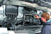 Po stránce motorické nejsou rozdíly, při nejmenším na papíře, veliké. V obou případech jsou nasazeny řadové šestiválcové motory. U Volva s objemem 12,8 litrů, u Mercedesu s objemem 12,9 litrů. Švéd nabízel při testu motor s 460 k, tedy o deset více než Němec. Točivý moment je u Volva 2300 Nm, u Mercedesu za normálních podmínek 2200 Nm. Ale co znamenají „normální“ podmínky? Top Torque (nejvyšší točivý moment) nazývají lidé od Mercedesu funkci, u které je při nejvyšším převodovém stupni odesláno dodatečných 200 Nm do převodovky. Fakticky to znamená, že Mercedes uspoří při stoupání zpětné řazení, neztratí tak rychlost a jede rychle a spořivě do kopce. Promyšlené řízení motoru Actros se vstřikováním Common Rail (Volvo nasazuje i nadále čerpadlo) ukazuje spíše výhody. Pohonná jednotka Daimler reaguje již u 800 ot/min, zatímco motor Volvo potřebuje cca o 100–150 otáček více. Ale i přes vyšší otáčky je Volvo zřetelně těžší. Také v tomto bodu se Volvo přibližuje osobním autům. Přicházející provedení Euro VI je o pár decibelů tišší. Tedy stručně řečeno: co se týče hodnocení motoru, je zde malý náskok pro Actros. Také z důvodu citlivého dávkování a silnější motorové brzdě. Také nás nadchlo, jak nízké otáčky potřebuje motor k rozjezdu. Ale jak bylo řečeno: rozdíl je nepatrný. Převodovka: Volvo vytvořilo něco nového. Stejně jako dříve, řadí I-Shift rychleji a poskytuje dostatečný výkon v těžkých situacích, jako např. řazení ve stoupáních, nebo umožňuje citlivé couvání do malého stoupání k rampě. To funguje opravdu perfektně. Také řízení spojky zvládli Švédové lépe. Ne, že by spojka Powershift byla špatná, I-Shift je zkrátka lepší.