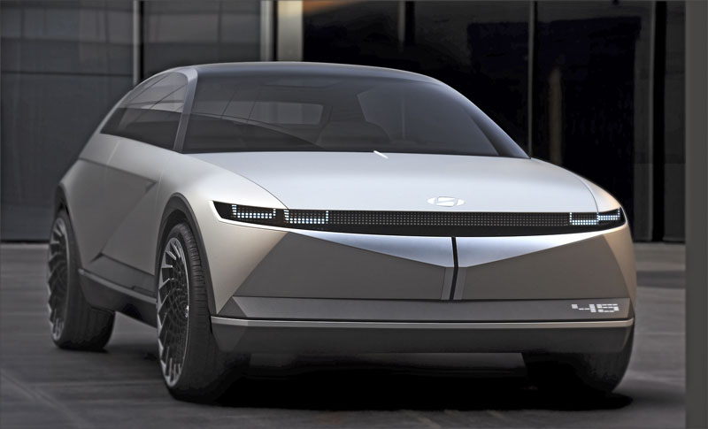 Nejnovější ukázkou směřování značky Hyundai v budoucnosti je studie Hyundai 45 EV, vzdávající hold modelu Hyundai Pony, který se začal vyrábět před 45 roky. Tento moderní vůz v sobě nese nezaměnitelné retro prvky, ale především se vyznačuje elektrickým pohonem. Překvapuje řešením interiéru s dominantním displejem a komfortními samostatnými sedadly. Originálně jsou navržené také světelné prvky vozu, jež vytvářejí neopakovatelné efekty.