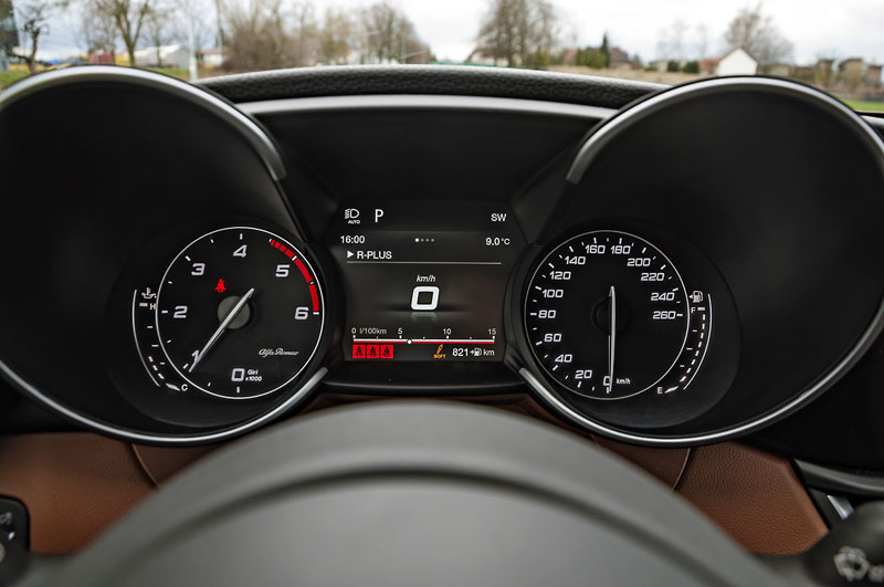 Ačkoliv běžné verze typu Giulia nepřitahují pozornost tak moc, jako se tomu děje v případě Giulie QV, stále platí, že jde o na pohled mimořádně povedený vůz. Design pracující s typickou maskou této značky a nízkou siluetou dokáže zapůsobit i tři roky od premiéry, a to dokonce v kombinaci s celkem běžnou výbavou. Testovaný automobil dorazil v druhé nejdostupnější variantě Super. V konfigurátoru stačilo zvolit jasně červenou baru karoserie, připlatit 10 000 Kč za žluté brzdiče a 12 000 Kč za osmnáctipalcové ráfky Turbine a výsledkem byly situace, kdy kolemjdoucí spokojeně pokyvovali hlavou. Po stránce vnějšího designu se hodí zmínit ještě jednu drobnost. I vznětová Giulia využívá dvě viditelné a opravdu funkční koncovky výfuku, což už v dnešní době není ani u kompaktních prémiových sedanů pravidlem. Sportovní naturel vozu poznáte také v interiéru. Nejde ani tak o velmi sportovní prvky výbavy jako spíše o skutečnost, že se sedí relativně nízko a že pozice za volantem je naprosto ideální. Výbava Super obsahuje dvoubarevné čalounění kombinující kůži a látku, což na pohled opět nevypadá vůbec špatně. Sedadla mají solidní boční vedení a minimálně dostatečné rozměry. Interiér jako takový je jednoduchý. Uspořádání palubní desky v některých ohledech trochu připomíná starší BMW, ale důležitější jsou přehlednost a fakt, že vás při jízdě nikde nic neruší. Potěší startování tlačítkem umístěným po vzoru vozů Ferrari vlevo na volantu a v případě testované osmistupňové převodovky také rozměrné kovové řadicí páčky pod volantem. Tyto dva detaily jsou konstantní připomínkou příbuznosti s legendární automobilkou Ferrari, a to u konkurence jen tak nenajdete. Co naopak u konkurence najdete, to jsou propracovanější multimediální systém, kvalitnější displeje, lepší materiály a v určitých ohledech i lepší zpracování. Páčky pod volantem pro manuální řazení sice působí opravdu dobře, ale například plastový volič převodovky pozitivní dojmy kazí.