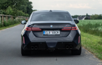 Po technické stránce jsme si BMW M5 (G90) a M5 Touring (G99) představili už na jaře letošního roku (viz AR 11/’24). Sedmá generace proti svému předchůdci velmi narostla, a to ve všech směrech. Rozvor náprav se dokonce dostal přes třímetrovou hranici a celková délka modelu s karoserií sedan překračuje pět metrů. Vůz je zároveň o skoro 4 cm vyšší, ovšem má o 17 mm nižší světlou výšku. Už jen z těchto údajů je evidentní, jak mohutné aktuální vydání BMW M5 je. Výrazné nárůsty pak evidujeme také u rozchodu kol (+58 mm vpředu, +65 mm vzadu). Tyto skoro až masivní proporce pravděpodobně stojí za občasnou kritikou designu, nicméně jak je vidět na fotografiích, i generace G90 se dá konfigurovat tak, aby působila nenápadně. Na první pohled u takto výkonného vozu v každém případě nejvíce udeří do očí ekologické registrační značky EL a nabíjecí port na levém předním blatníku.