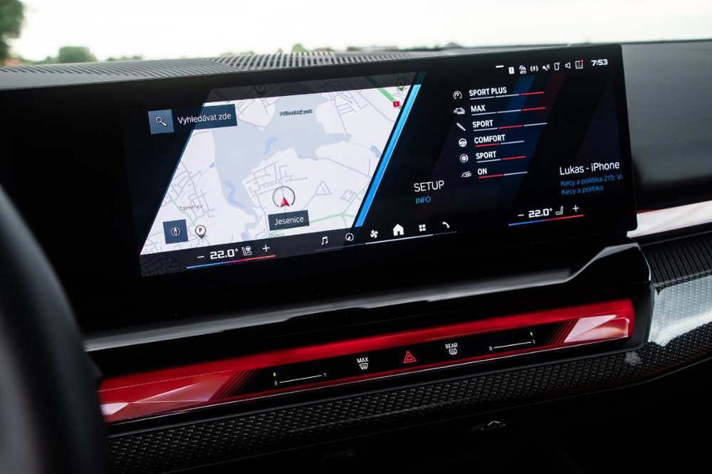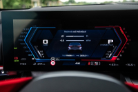 Častou kritikou plug-in hybridů bývá rozdílná dynamika s nabitými a vybitými akumulátory a někdy je tato kritika oprávněná. Tady to ovšem neplatí. Vůz jsme měřili s vybitými akumulátory, respektive s udávaným elektrickým dojezdem 0 km. Vždy stačí jedno intenzivnější brzdění a systém okamžitě nasbírá elektrickou energii, již následně znovu využije. Dobře to bylo vidět později během testovacího týdne, kdy jsme s M5 vyrazili na svižnější projížďku po okresních komunikacích. Na začátku jsme měli elektrický dojezd 0 km, po projížďce systém ukazoval 25 km. Množství jízdních charakterů je asi největším kouzlem tohoto sofistikovaného stroje. Na denních trasách může fungovat jako bezemisní elektromobil, jinde to může být klasický hybrid a po zmáčknutí jednoho ze dvou červených tlačítek je najednou výsledkem dynamika supersportu. Konkrétní nastavení pak bude ovlivňovat i výslednou spotřebu, jež se může bez přehánění pohybovat někde v rozmezí 0 až třeba 30 l/100 km. BMW M5 si pochopitelně přebírá veškeré elektrické „vychytávky“ známé z jiných plug-in hybridních typů, včetně možnosti „zakonzervovat“ nabití akumulátorů na později nebo rozložení elektřiny uložené v akumulátorech na celou trasu. Abychom ale mohli porovnávat toto měření s výsledky z testu generace F90, které jsme naměřili v roce 2018, trasu pro měření spotřeby jsme objeli se zcela vybitými akumulátory. Pohon tak fungoval v režimu klasického hybridu.