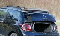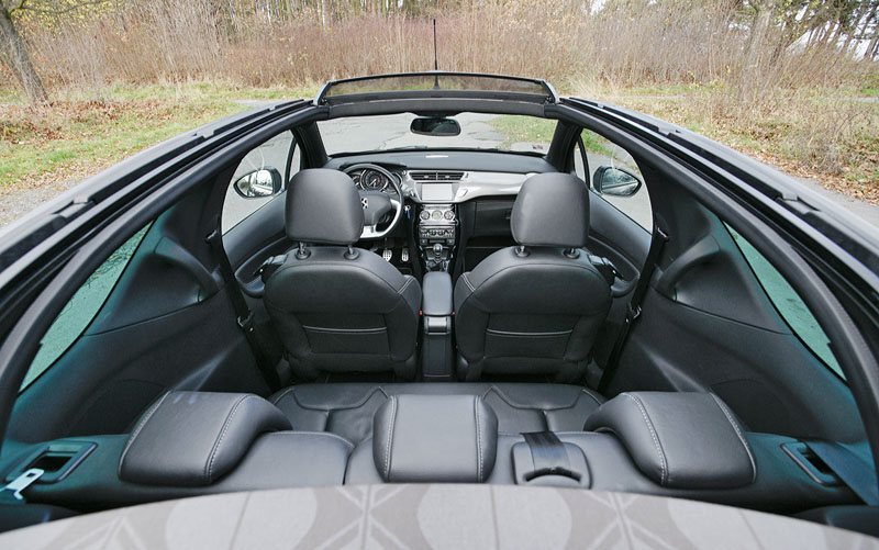Ta se stlačením tlačítka u rámu čelního skla nejprve posune nad zadní sklo, dalším stlačením pak spolu s ním do konečné plně otevřené polohy nad nízké víko zavazadlového prostoru. Celý pohyb střechy (v klidu i za jízdy) trvá podle výrobce (Webasto) asi 16 sekund, sami jsme ale naměřili asi o sedm více. Dalším rozdílem je zavazadlový prostor, resp. přístup k němu. Otevírá se při zavřené nebo jen částečně otevřené střeše přibližně posuvným pohybem, definovaným kinematikou závěsů, díky níž jen nepatrně zasahuje mimo půdorys vozu. Až na zavazadlový prostor je přístup k interiéru stejný jako u DS3, při otevírání 1330 mm širokých dveří až o 60° je ovšem třeba dbát na dostatečný odstup od vedle stojícího vozidla nebo jiné překážky, neboť při plném otevření vystupuje nejvzdálenější okraj dveří z půdorysného profilu vozu téměř o 1100 milimetrů. Poněvadž DS3 Cabrio je karosářskou variantou základního dvouprostorového vozu, shoduje se s ním většinou vnitřních rozměrů, neomezených konstrukcí otevírací střechy.