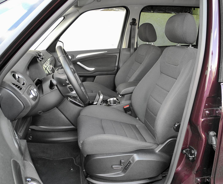 Jsou-li vzpřímena všechna sedadla, je zavazadlový prostor dlouhý v rovině podlahy 490 mm, široký 1210 mm a vysoký k hornímu okraji opěradel třetí řady 490 mm. Sklopením sedadel třetí/druhé řady se zvětší ložná délka na 1440/1880 mm. Zavazadlový prostor doplňuje množství menších úložných schránek v přístrojové desce, v podlaze a ve stropní konzoli. Ford Galaxy patří k vozům MPV s největší variabilitou interiéru díky řešení sedadel druhé a třetí řady se samostatně seřiditelnými, resp. posuvnými a sklopnými jednotlivými díly, umožňujícími dvou- až sedmimístné uspořádání. Nabízí se ve čtyřech úrovních výbavy Trend, Winner, Ghia a Titanium, z nichž poslední, nejluxusnější, měl testovaný vůz. Z bohaté palety jejích standardních prvků jmenujme mj. přední a boční airbagy předních sedadel, kolenní pro řidiče a okenní pro všechny řady sedadel, třízónovou automatickou klimatizaci, úchyty Isofix na všech samostatných sedadlech druhé řady (což přivítají početnější rodiny s třemi malými dětmi), dálkově ovládané centrální zamykání, palubní počítač, audiosoustavu s 11 reproduktory a přehrávačem CD/MP3, tempomat s omezovačem rychlosti, elektrické ovládání skel dveří i sklopných a vyhřívaných zpětných zrcátek, přední mlhovky, reflexní vyhřívané čelní sklo, úložné schránky v podlaze před sedadly druhé řady aj.