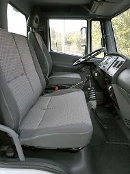 Kabina i v užším provedení nabízí dostatek místa řidiči a dvěma spolujezdcům. Dvouramenný, možná ale zbytečně velký, volant by mohl mít také silnější věnec. Plochá a mírně šikmá palubní deska je přehledná, ale přístroje postrádají jakékoliv odstínění. V zorném poli řidiče je vlevo velký otáčkoměr s digitálními hodinami, vpravo stejně velký rychloměr s počítadlem kilometrů, mezi nimi jsou svisle umístěny menší klasické analogové přístroje (palivoměr a teploměr). V horní části - resp. i pod velkými přístroji palubní desky je vodorovná soustava kontrolek. Vpravo od volantu na palubní desce je také svisle umístěna řada kolébkových spínačů (ne všechny ale jsou u každého modelu či výbavy obsazeny) a pak dnes již poněkud nemoderní, táhly ovládaný systém větrání a vytápění (což ale nic nemění na jeho účinnosti). Na motorovém tunelu pak je krátká řadicí páka, u konkrétního vozidla pak zde ještě byly dvě ovládací páky na mechanismus ovládání kontejneru. Sedadlo řidiče i volant jsou všestranně seřiditelné, už v základní výbavě jsou elektricky ovládaná skla ve dveřích i vyhřívaná zrcátka. Od celkové hmotnosti 5,6 tuny je ve vozidle standardně montován digitální tachograf umístěný ve spodní střední části palubní desky. Sklápění budky vpřed je manuální, hydraulický systém je dodáván až od celkové hmotnosti 9,5 tuny.