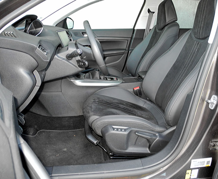 Cestující vzadu mají dost místa i pro nohy, nejsou-li ovšem přední sedadla posunuta co nejvíc vzad, kdy je mezi jejich opěradly a zadními sedáky mezera pouhých 70 mm, nastavením předních sedadel do střední polohy se zvětší na 195 (210) mm. Zatímco v prostoru pro cestující se vnitřní rozměry příliš neliší, rozdíly zavazadlových prostorů jsou velké. Za zadními opěradly jsou v rovině podlahy dlouhé 800 (1050) mm, široké 1080 (1050) mm a pod kryty vysoké 540 (490) mm. Sklopením zadních opěradel (u SW se současně snižují sedáky) se ložná délka zvětší na nejméně 1450 (1800) mm. Ergonomicky dobře řešený interiér zaujme inovativní koncepcí místa řidiče i-Cockpit s originální přístro-jovou deskou zbavenou všeho zbytečného a okázalého. Místo množství tlačítek a ovladačů má informační, navigační a řídicí soustavu, jejíž funkce se ovládají intuitivně dotykem příslušných symbolů na displeji 9,7“. Neobvyklé je i uspořádání hlavních přístrojů ve vyvýšeném panelu před volantem, se souměrně umístěnými číselníky rychloměru a otáčkoměru s nezvykle protisměrným pohybem ruček. Peugeot 308 patří k nejlépe vybaveným vozům své třídy.