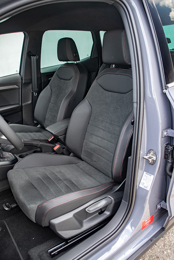 Kabinu patrně není nutné představovat, protože během sedmi let působení na trhu se Arona ukázala v naší redakci mnohokrát. V kontextu dnešní doby zaujmou celkem malé displeje a klasická tlačítka kombinovaná s otočnými ovladači. Něco do sebe takhle řešená ergonomie pořád má a v praxi je uživatelsky přívětivější než dotykové ovládání všeho v jednom. Důkazem budiž fakt, že i samotný koncern Volkswagen se k tlačítkům pomalu zase vrací. Konstrukční stáří typu Arona prozrazuje nutnost startovat vůz klasickým klíčkem (i ve výbavě FR Limited Edition se za bezklíčový přístup a startování musí připlácet) nebo schopnosti multimediálního systému. Protože ale umí Apple CarPlay/Android Auto, reálným zákazníkům to vadit nebude. Prostě si připojí telefon a budou používat vestavěnou obrazovku pouze k jeho zrcadlení. Beztak jsou v této cenové úrovni chytré telefony obvykle lepší než automobilové systémy.
