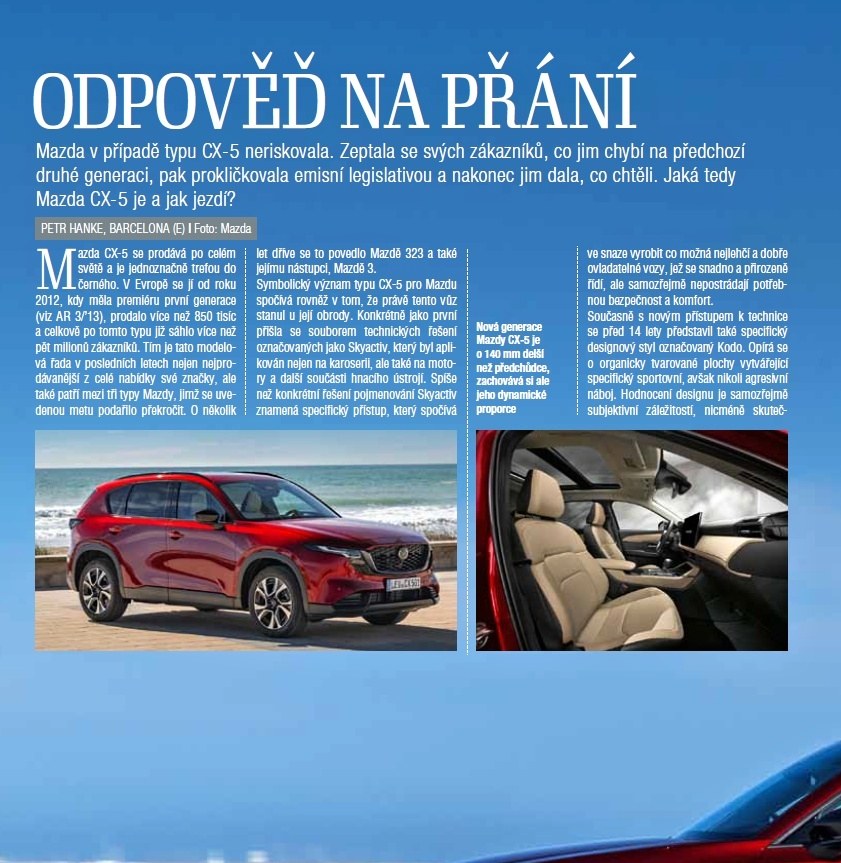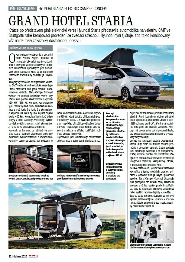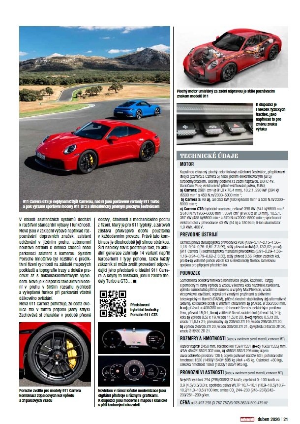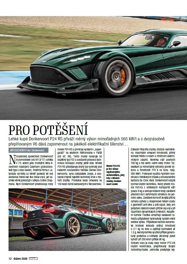 A na co se můžete těšit? Namátkou vybíráme nové BMW i3, ultimativní Donkervoort P24 RS a prototyp kempinkového vozu Hyundai Staria. Vyzkoušeli jsme pro vás nejen čerstvé generace typů Mazda CX-5, Subaru E-Outback či Renault Clio, ale též průlomový kompaktní elektromobil Kia EV2. V rubrice Náš test vám představujeme střízlivý Leapmotor B10, zatímco emoce budí Porsche 911 (992.2) a Aston Martin DBX S. V technické sekci zdůrazněme kromě humanoidních robotů ve výrobě automobilů BMW a reportáže z otevření haly M8 na výrobu akumulátorů v Mladé Boleslavi především čtyřstránkovou studii Ing. Josefa Morkuse, CSc., nahlížející problematiku snižování emisí CO2 a zavádění elektromobilů z čistě vědeckého hlediska. A zavzpomínáme například na 40 let účasti vozů Tatra na Dakaru či unikátní sérii šesti prototypů „Super laminátu“.