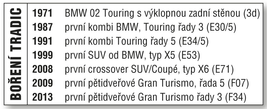 První kombi BMW řady 3 (E30), pojmenované Touring, v roce 1987 určitě bylo velmi diskutovaným rozšířením výrobního programu populární řady 3. Letos je tomu podobně, do nabídky BMW se dostává neobvyklá další karosářská verze trojkové řady, zcela nové provedení Gran Turismo (F34) s výklopnou stěnou v zádi. Svým pojetím navazuje na větší BMW řady 5 Gran Turismo, ale přesto si zachovává poněkud odlišný vlastní charakter. BMW řady 3 Gran Turismo samozřejmě používá malou platformu BMW, sdílenou s typovými řadami 1, 3, X1, X3 a Z4. Jeho poznávacím rysem je přední náprava s pružinovými vzpěrami McPherson. Právě nové Gran Turismo je ze všech vyjmenovaných automobilů nejdelší a má největší rozvor náprav.