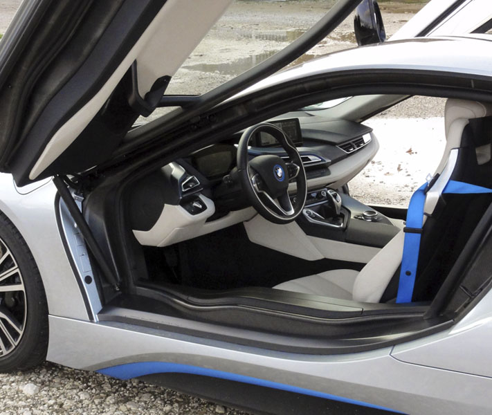 Pro sériovou výrobu i8 dostal přednost zážehový tříválec nové generace 1.5/170 kW (231 k), doplněný rovněž dvojicí elektromotorů. BMW i8 Concept se zážehovým motorem se představil na IAA 2011 ve Frankfurtu, produkční verze následovala na IAA 2013 a prodej revolučního kupé byl zahájen v létě 2014 (pro modelový rok 2015). BMW i8 je první sériově vyráběný sportovní automobil modrobílé značky s vnějším dobíjením Plug-In Hybrid, první s laserovými hlavními světlomety (za příplatek, viz AR 5/’14) a první poháněný tříválcovým spalovacím motorem (nová generace, viz AR 6/’14). Exotický vzhled podtrhují vzhůru výklopné boční dveře, interiér má sedadla v uspořádání 2+2, zadní jsou víceméně nouzová, spíše pro odkládání menších zavazadel (při testu ve Francii jsme si kufry poslali zvlášť jinou cestou). Na předních sedadlech je poměrně dosti místa, o zadních se to tedy říci nedá. Výška stropu nad nízko uloženými sedáky je podle údajů výrobce vpředu/vzadu 983/824 mm, šířka ve výši loktů činí vpředu/vzadu 1522/1308 mm. Při otevření dveří vyklápěním vzhůru vpřed (při vichřici v Miramas to bylo trochu obtížnější!) vzroste výška vozu ze zavřených 1293 mm na 1958 mm, takže pozor v nižších garážích; na šířku při otevření obou dveří naráz potřebujete celkem 3046 mm (při otevření na jedné straně se šířka 1942 milimetrů zvětší o 552 na 2494 mm). Při každém zastavení však budíte zaslouženou pozornost!