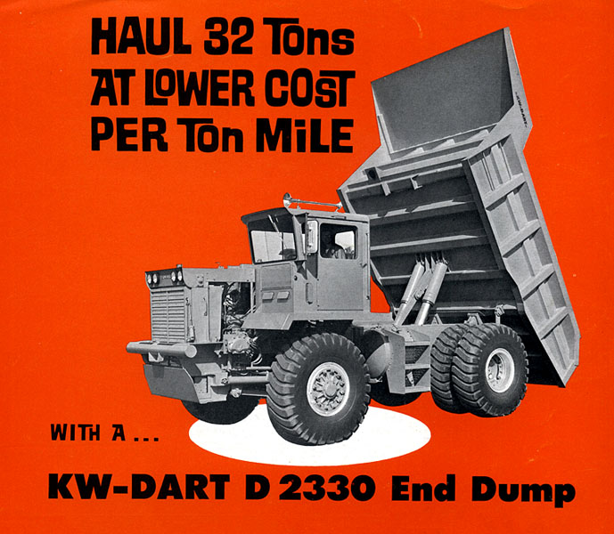 Specialistou na těžké sklápěče pro provoz mimo silnici v povrchových dolech a na velkých stavbách se firma Dart Truck Company z Kansas City (Missouri) stala až po spojení s Kenworthem, legendárním výrobcem dálničních tahačů (krátce od 1961 nesla značku KW-Dart). Na jejich základě zavedla také výrobu těžkých nakladačů, jak čelních lopatových, tak speciálních pro těžbu dřeva. Pod jménem Dart byla součástí koncernu PACCAR (Pacific Car & Foundry) v letech 1958 až 1988, který vedle železničních vagonů sdružoval výrobu těžkých nákladních automobilů Kenworth, Peterbilt, DAF, Foden a Leyland, kromě jiných strojírenských produktů. Na této dvoustránce představujeme typické výrobky Dart, zvláště z přelomu sedmdesátých a osmdesátých let. Těžké sklápěče Dart 3120 (120 tun), 3100 (100 tun) a 3065 (65 tun) se znakem náprav 4x2 mají mechanický přenos výkonu přes šestistupňovou samočinnou převodovku Allison s kapalinovým měničem na zadní kola, jež nesou v nábojích konečné planetové redukce.