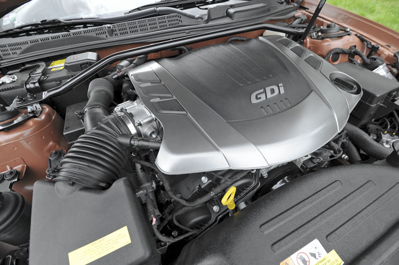 V nabídce zůstávají oba motory, nyní však po řadě úprav s výraznými nárůsty výkonu i točivého momentu. Vidlicový šestiválec 3.8 V6 Lambda s atmosférickým plněním dostal přímé vstřikování benzinu GDI a posílil ze 223 na 255 kW (303, respektive 347 k) při otáčkách zvýšených o 100 na 6400 min‑1; největší točivý moment se zvýšil ze 361 N.m/4700 min‑1 na úctyhodných 400 N.m/5300 min‑1; podle typu převodovky se zlepšilo zrychlení na sto až o 0,4 sekundy, ale největší rychlost vzrostla o dvacet na 260 km/h, to vše při téměř shodné spotřebě paliva. Ještě větší nárůst výkonu nabízí dvoulitrový čtyřválec Theta II TCI, nyní vybavený přeplňováním turbodmychadlem Twin-Scroll a větším chladičem stlačovaného vzduchu (o 53 %), který dosahuje výkonu 202 kW (275 k)/6000 min‑1 a točivého momentu 372 N.m/2000 až 4500 min‑1 (dříve jen 299 N.m). Také v tomto případě se zkrátily časy zrychlení 0 – 100 km/h z 8,0 na 7,4 sekundy, největší rychlost z 223 vzrostla na 236 km/h. Spotřeba paliva EU však zůstala zhruba na stejné úrovni (9,4 l/100 km s převodovkou 6M). Oba motory mají plynule proměnné časování sacích i výfukových ventilů Dual-CVVT (Continuously Variable Valve Timing). Podle jednotlivých trhů se dodávají alternativní převodovky, oba motory jsou k dispozici jak se šestistupňovou manuální (mírně se změnily převodové poměry), tak s novou osmistupňovou samočinnou z vlastního vývoje Hyundai, která umožňuje i přímé řazení páčkami pod volantem (automobil na našich snímcích s motorem V6). Zlepšila se rovněž funkce spojky u manuální verze, také plynový pedál nyní umožňuje jemnější ovládání vozu.