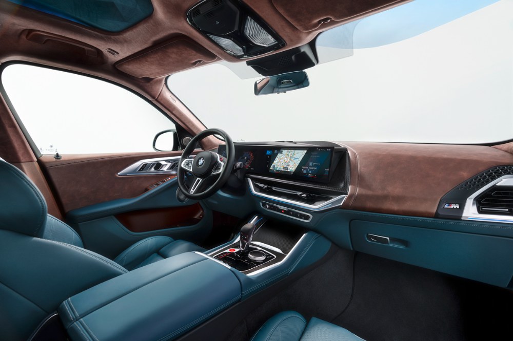 Netradiční přístup zvolilo BMW i při návrhu interiéru modelu XM. Palubní deska se nese v nejnovějším stylu značky a vyznačuje se prohnutým jednolitým displejem propojujícím obrazovku určenou pro zobrazení přístrojů (12,3“) a zobrazovací plochu infotainmentu (14,9“). Palubním systémem je tedy osmá verze ovládacího systému iDrive s nejnovějším stavem konektivity v podobě možnosti instalace osobní eSIM karty nebo připojení 5G. V tom se XM neodlišuje například od modelu iX nebo třeba i modernizované řady 3.