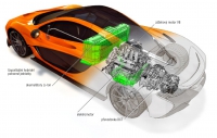 Kapacita inovativních akumulátorů Li-Ion (324 článků v těžišti před motorem) dovoluje v režimu E‑Mode standardní dojezd 11 km, jenž při pomalé jízdě průměrnou rychlostí 48 km/h (30 mph) může vzrůst až na dvacet, což, jak uvádí McLaren Automotive, postačí majiteli k vyjížďce do restaurantu v městské Zero Emission Zone i k návratu domů. Celkový výkon soustavy pak činí 674 kW (916 k) a maximum točivého momentu 900 N.m už od 4000 min-1! Oba motory pohánějí zadní kola prostřednictvím sedmistupňové dvouspojkové převodovky (DCT) se sekvenčním řazením páčkami pod volantem, či v samočinném režimu (pro E‑Mode pouze automat). Akumulátory lze dobíjet několika způsoby, buď přímo zážehovým motorem/generátorem ve voze po stisknutí tlačítka Charge např. před vjezdem do bezemisní zóny (za deset minut, po plném nabití se osmiválec vypne), či nabíječkou Plug-In do dvou hodin ze zásuvky. Uváděná dynamika je impozantní, vůz zrychluje na sto za 2,8 sekundy, dvoustovku zvládne za 6,8 sekundy a na 300 km/h mu stačí 16,5 sekundy, což je o více než 23 procent rychlejší než u legendárního třímístného McLarenu F1!