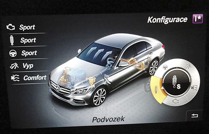 Program Eco klade důraz na hospodárnost, upravuje rekuperaci pro největší dojezd, využívá ECO Assist (mj. pracuje s radarem detekce vozidel vpředu, impulsem v plynovém pedálu vybídne k sejmutí nohy a rekuperuje), při kombinaci Hybrid/Eco se zapnutým naváděním k cíli upravuje nabití akumulátoru podle průběhu trasy, elektrický pohon a vypínání zážehového motoru je možné do 160 km/h. Programy Sport a Sport+ pak jsou zaměřeny vždy na výkon, spalovací motor se po jejich volbě nevypíná. Pátou možností je Individual, kdy si odezvu poháněcí soustavy, podvozku, řízení, asistenta ECO a klimatizace zvolíte podle svého vkusu (kombinací z jiných nastavení, např. sportovní řízení a komfortní podvozek). Jízda je velmi příjemná, ale hmotnost akumulátorů vzadu je v zatáčkách občas znát, zejména na méně kvalitních silnicích; také zavazadlový prostor se zmenšil ze 480 na 335 litrů objemu. Soustavu pohonu tvoří vpředu podélně uložený zážehový čtyřválec 2.0/155 kW (211 k), přídavná spojka před trakčním elektromotorem/generátorem 60 kW ve skříni sedmistupňové samočinné převodovky 7G-Tronic Plus Hybrid (elektromotor se spojkou je na místě kapalinového měniče momentu), spojovací hřídel, rozvodovka s diferenciálem zadní nápravy a hnací poloosy. Dobíjení kabelem (zásuvka v nárazníku vpravo vzadu) trvá 1,5 až 3 hodiny podle nabíječky; webová aplikace Mercedes connect me slouží mj. řízenému nabíjení Plug-In podle nastaveného času, kontrole dojezdu, stavu akumulátorů, dálkovému zahřátí či vychlazení interiéru apod. Není bez zajímavosti, že C 350 e se dodává výhradně s pneumatickým odpružením Airmatic. Platí to jak pro sedan (cena od 1 289 860 Kč), tak pro kombi (od 1 345 860 Kč). Vznětový C 300 h, ale s ocelovými pružinami, zůstává v nabídce.